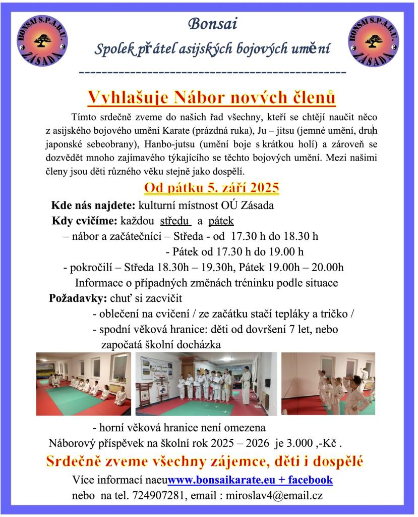 Bonsai Spolek přátel asijských bojových umění srdečně zve všechny, kdo mají zájem o asijská bojová umění, k náboru nových členů. Tréninky probíhají každou středu a pátek, kde se můžete naučit Karate, Ju-jitsu a Hanbo-jutsu. Přijímáme děti od 7 let a dospělé bez horní věkové hranice. Náborový příspěvek na školní rok 2025 – 2026 činí 3.000 Kč. Pro více informací navštivte naše webové stránky či nás kontaktujte telefonicky nebo e-mailem.