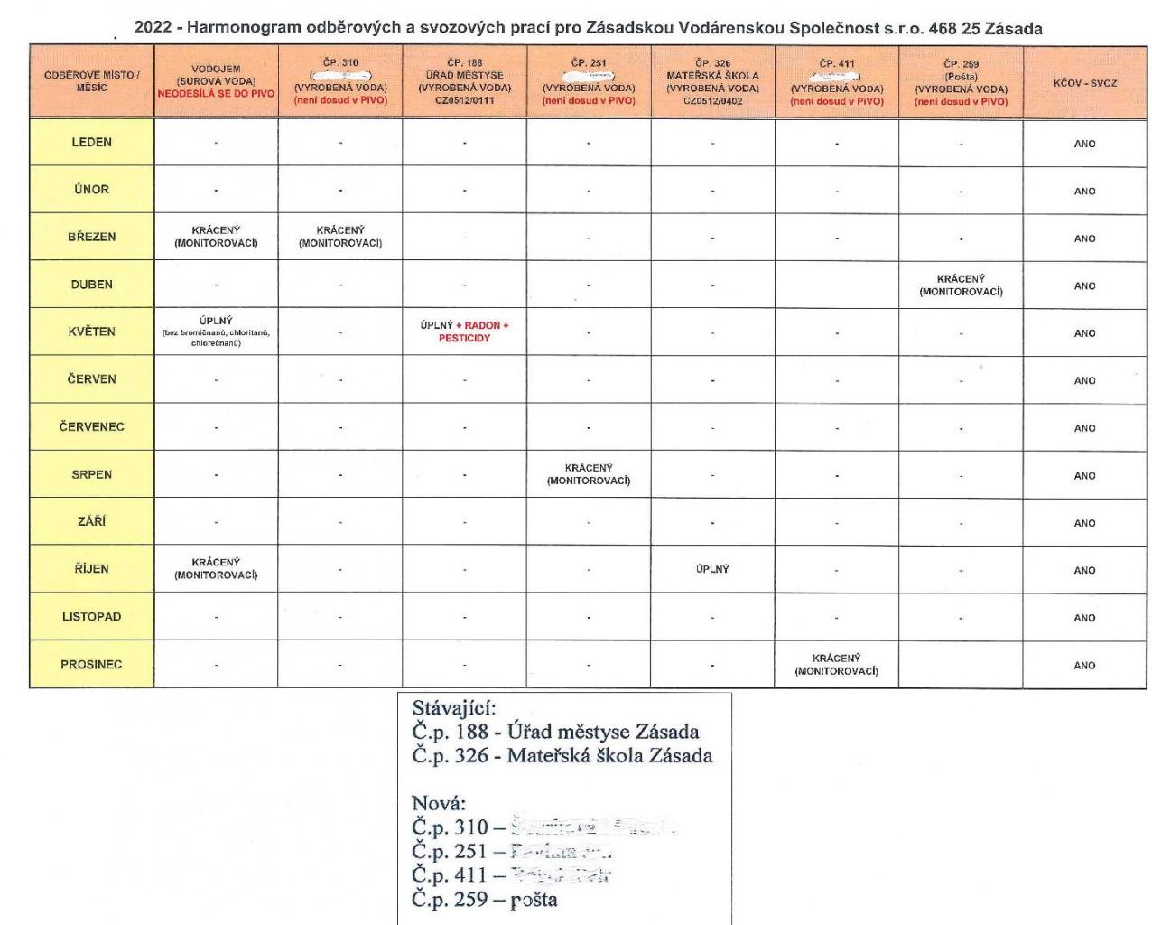 2022 - Harmonogram odběrových a svozových prací pro Zásadskou Vodárenskou Společnost s.r.o. 2