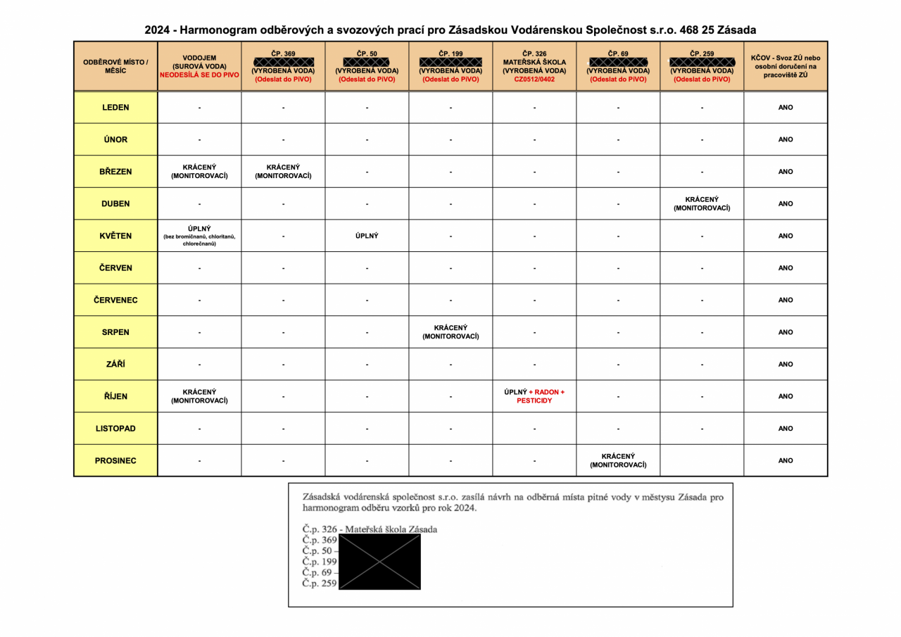 2024 - Harmonogram odběrových a svozových prací pro Zásadskou Vodárenskou Společnost s.r.o.