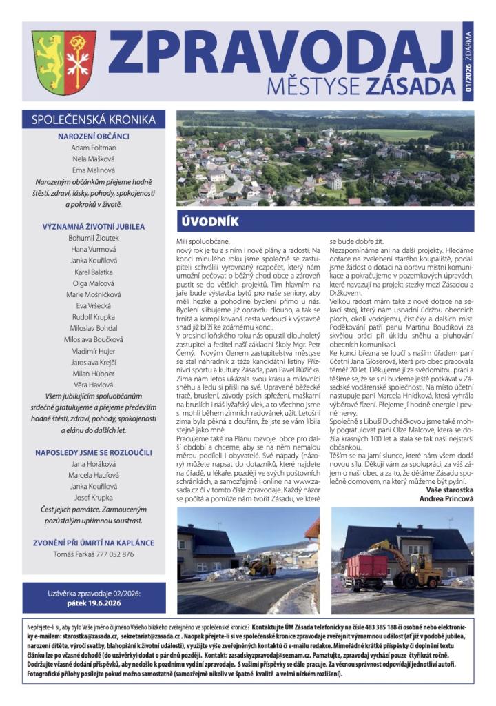 Období leden 2026 - březen 2026. Přečtěte si nejnovější vydání Zásadského zpravodaje, které pokrývá události a novinky z období leden až březen. Dozvíte se o kulturních akcích, společenských setkáních a dalších zajímavostech z regionu.