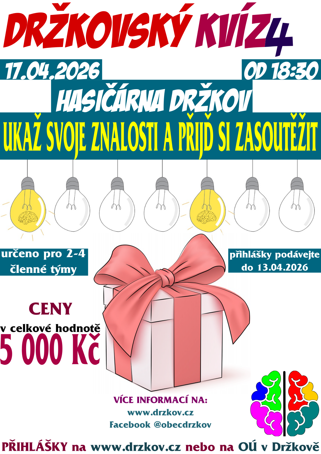 Přihlášky (dole ke stažení) zasílejte na email: mistostarosta@drzkov.cz a do předmětu zprávy napište heslo Kvíz nebo vyplněné přihlášky zaneste v úředních hodinách na obecní úřad v Držkově.